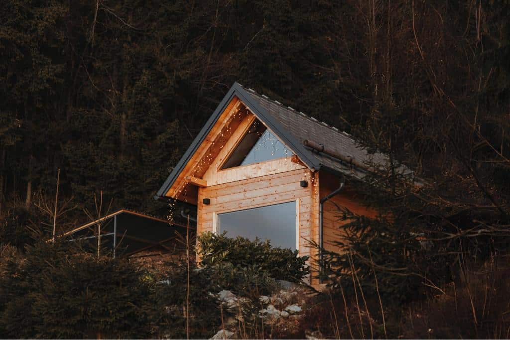 Your sleeping area is set in a charming, separate wooden house with large panoramic windows that bring the magic of the forest directly into your room.